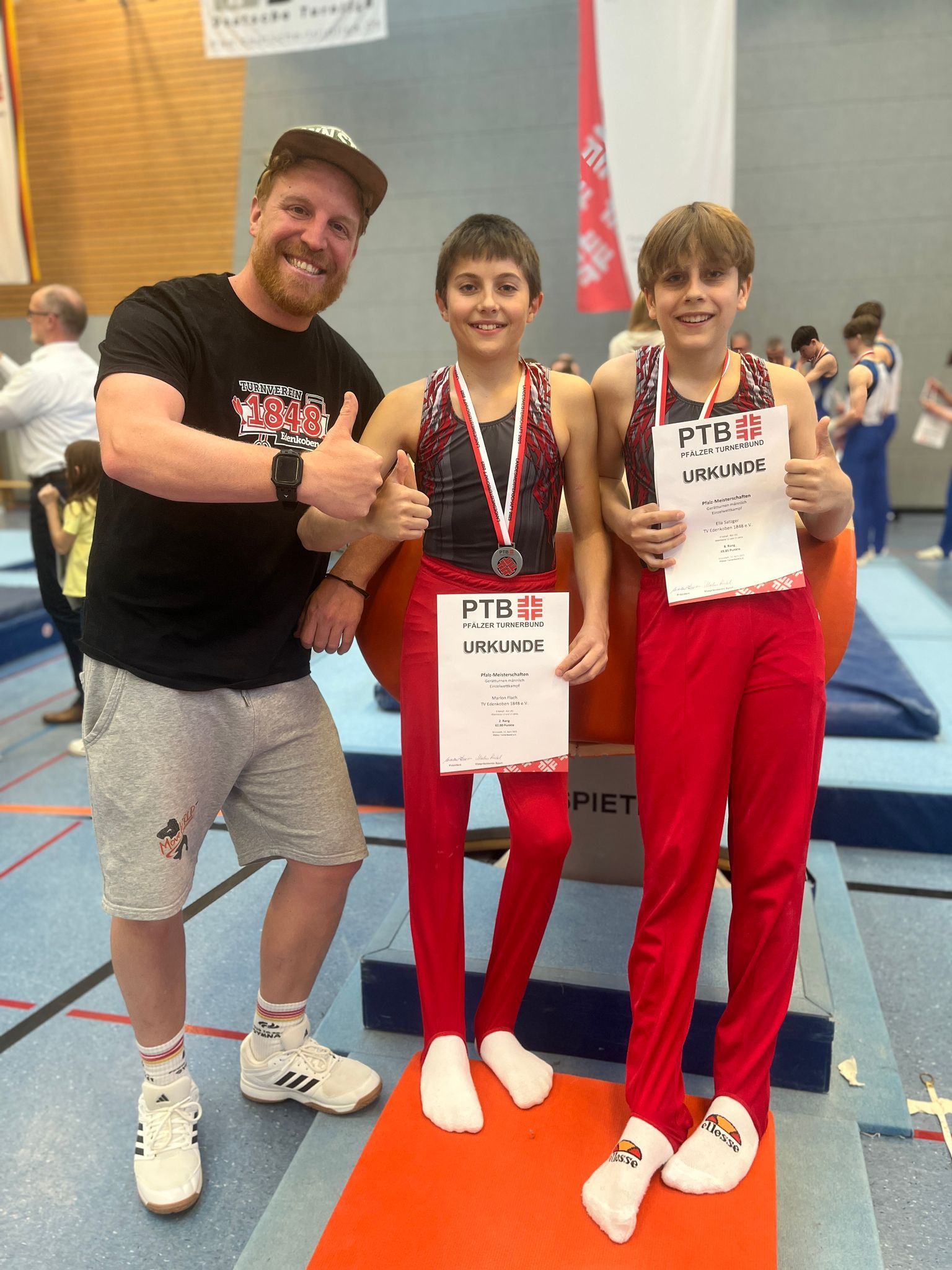 Einen großartigen Wettkampf sahen die Edenkobener Fans von den 12/13-jährigen. Jonas Bungert verpasste mit Platz 11 äußerst unglücklich ein Top-Ten-Ergebnis, zeigte aber vor allem an seinem Lieblingsgerät, dem Boden, eine bärenstarke Leistung. Während sich schnell zeigte, dass der Sieg in dieser Altersklasse nach Bad Bergzabern gehen wird, entbrannte ein äußerst spannender Kampf um die beiden weiteren Podestplätze – und mittendrin drei weitere TVE-Talente. Wie eng es beim Gerätturnen zugeht, musste dabei Elia Satzger erfahren. Ein unglücklicher Abstieg am Reck kostete die entscheidenden Zähler: 84,80 Punkte; Platz 6. Schon 0,1 Punkte mehr hätten Platz 4 bedeutet. Jona Satzger erzielte 86,10 Punkte und erhielt besonders am Boden und Reck sehr gute Wertungen: Bronze. Mit Nico Schulz stand gleich noch ein zweiter TVE-Turner auf dem Podest und gewann Silber. Nico konnte vor allem am Boden und Barren seinen Kontrahenten Punkte abnehmen und erreichte in der Gesamtrechnung 86,90 Punkte. Für die Pfalzmeisterschaften in Grünstadt ist Spannung programmiert. Dort wird der krankheitsbedingt fehlende Friedrich Nicklis ebenfalls noch mitmischen.